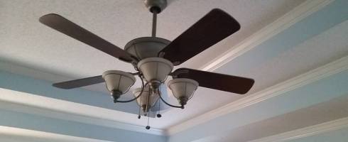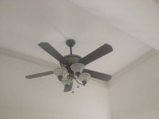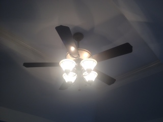 The ceiling fan in the master bedroom was a joke. It came with the house. The light fixture had 3 lights that had a globe cover to it and did not put out much light. Our room always felt dark. The fan itself was horrible. It was set on high speed, but the motor was starting to crap out, making high speed look and feel like low speed. Seriously. Molassis dripped faster than this fan went! The Dude and I knew we had to replace it. Several weeks ago, we went to one of the big box home improvement stores to window shop for a new fan. We found one we liked, to the tune of $110.00. It was pretty, shiny and new. But, for now, outside our budget. We figured, now that we found one we liked, we could start saving for it and maybe get it in a month or so.